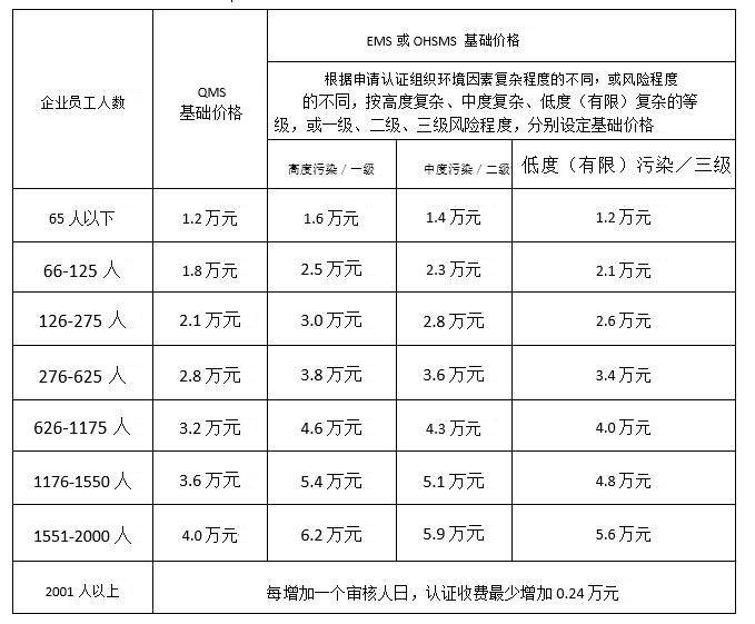 2)同等人数规模,但组织内部机构复杂程度不同。例如:一个集团性公司下属若干公司/分公司/事业部同时申请认证,与单一公司申请认证,尽管人数可能相同,但认证的复杂程度和工作量显然不同,前一企业的认证费可能高于后一企业;